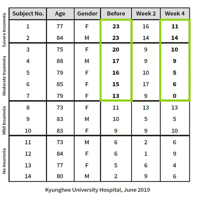 En ensayos clínicos realizados en el KRISS (Instituto de Investigación de Normas y Ciencias de Corea) y el Hospital Universitario Kyunghee en 2019 y 2020, se demostró la eficacia del tratamiento mediante análisis de EEG (onda cerebral), electrocardiograma (ECG), melatonina (hormona) e Insomnio Índice de gravedad (ISI).